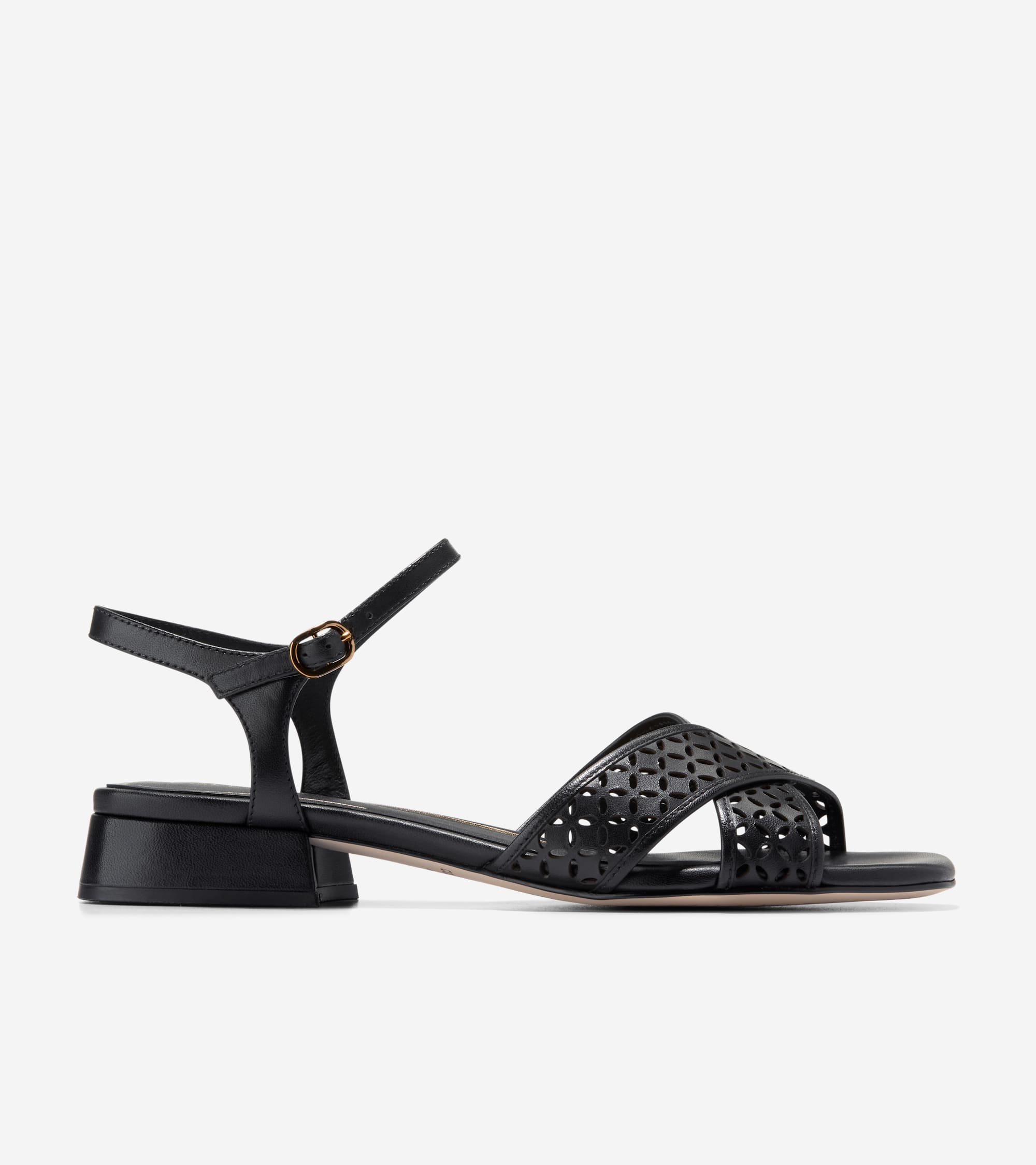 Perforated leather upper in Black; ankle strap with adjustable buckle